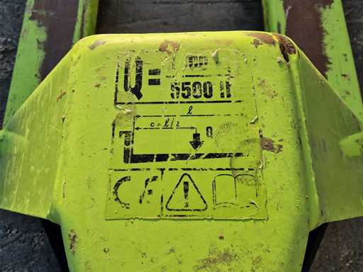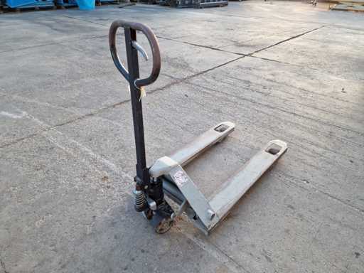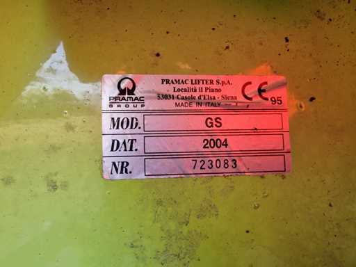- Ręczny wózek paletowy PRAMAC GS: numer seryjny 723083, rok produkcji 2004, ładowność 2500 kg, wymiary widelca 1150 x 700 mm.
