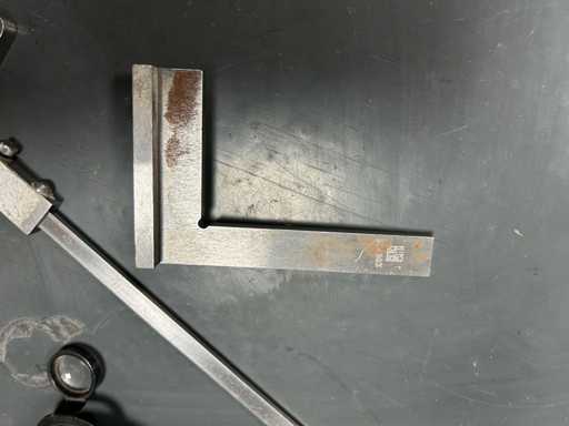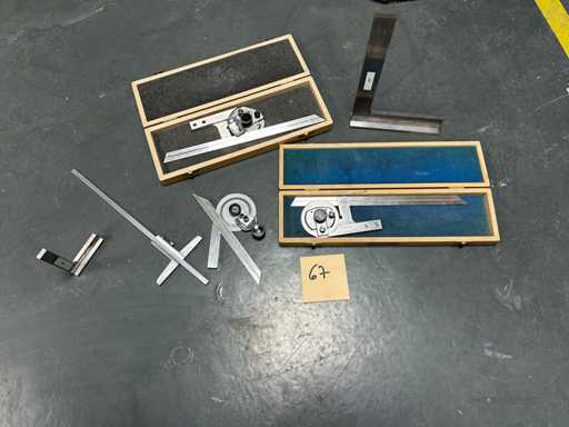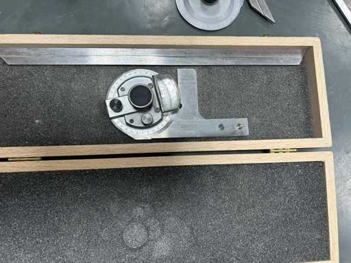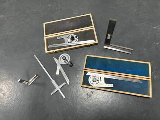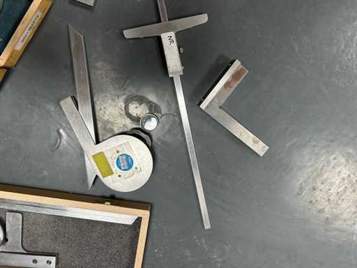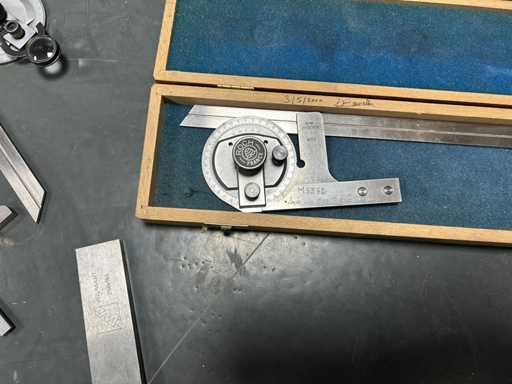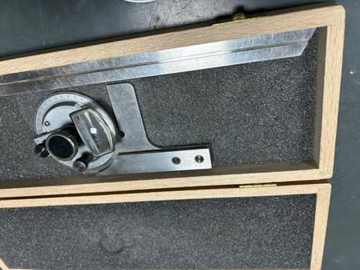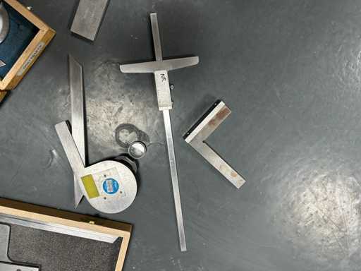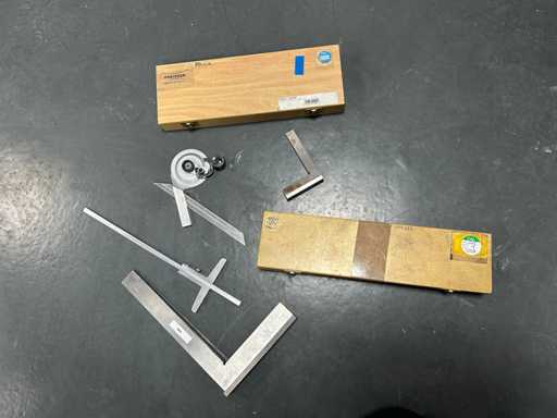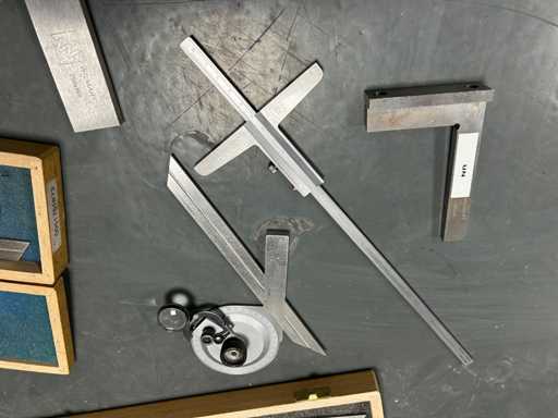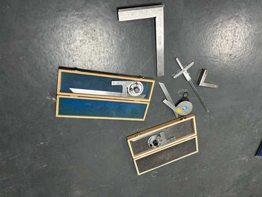3 kątomierzy z dedykowanymi ostrzami i lupą (ROCH, PREISSER) • 2 stalowe uchwyty z podeszwą • 1 stopa głębokości 0,02 mm stalowego werniera • Instrumenty warsztatowe do sterowania kątami i kwadratowania.