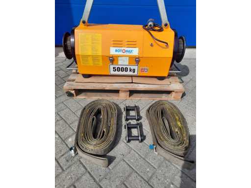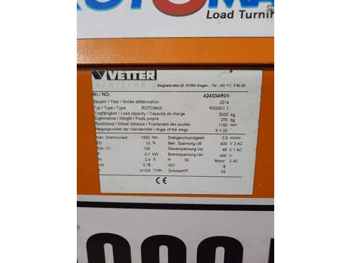 Obracarka ROTOMAX R 5000/1.1 jest w bardzo zadbanym stanie i kompletna, co widać na zdjęciach. Urządzenie jest od razu gotowe do użycia. Wyposażony w udźwig 5000 kg, HOH 1100 mm, prędkość 2,5 m/min i napędzany silnikiem elektrycznym o napięciu 380 woltów. Rok budowy 2014. Pod względem technicznym, optycznym i ogólnym maszyna jest w bardzo dobrym stanie i dlatego może być natychmiast użyta.