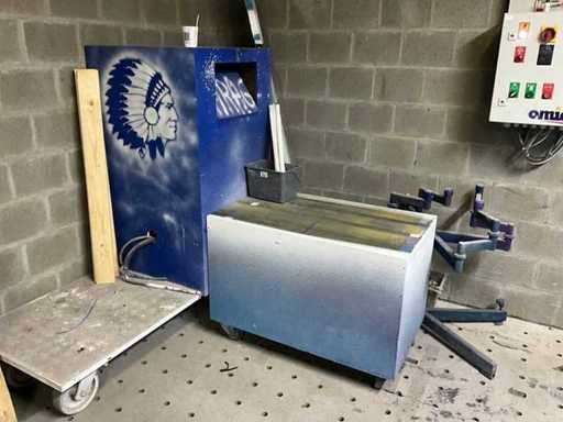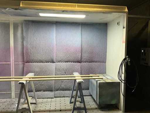 Składająca się z ściany natryskowej z filtrami i ssaniem, pompy Wagner Airles do farb w szafie ochronnej, panelu sterowania, mostach i statywach do malowania, może być demontowana przez miedź Z WYŁĄCZENIEM dachu z 2x wystającą!!