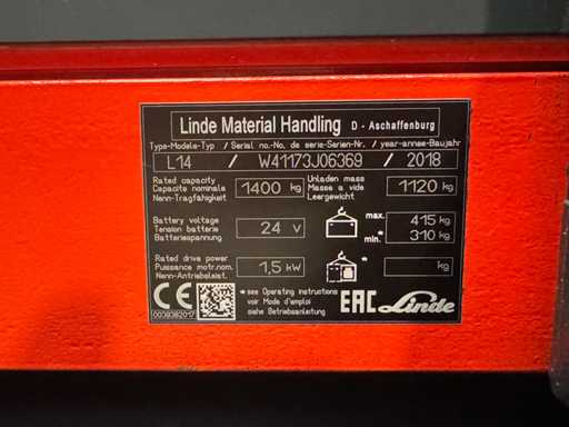 Serwis 2018 +UVV 09/2026 Linde L14 Lithium Li-ION 1.400kg Paletowy wózek Ant 2.300 godzin