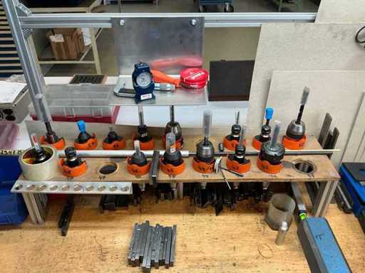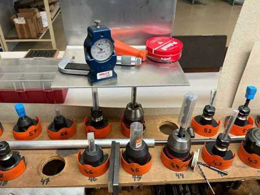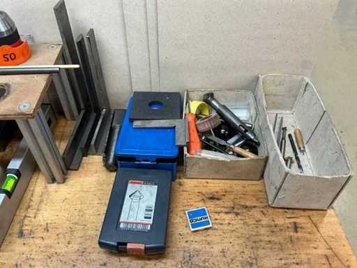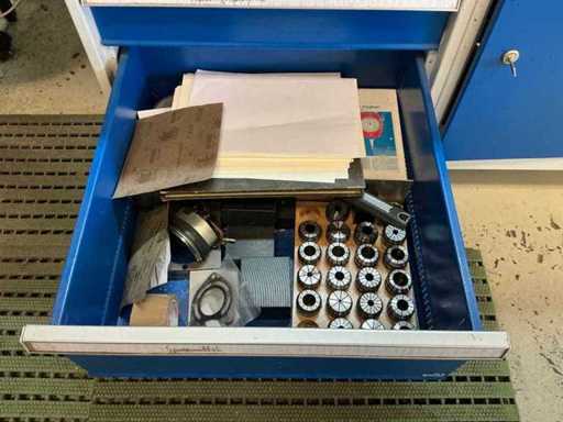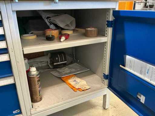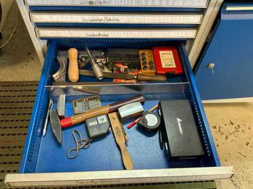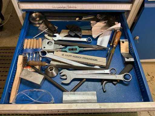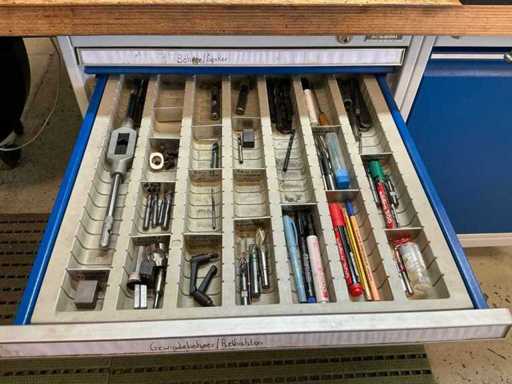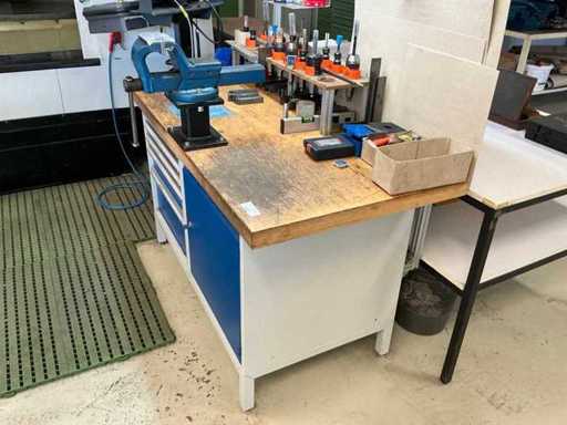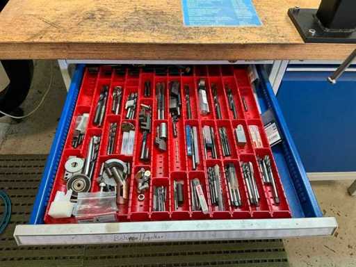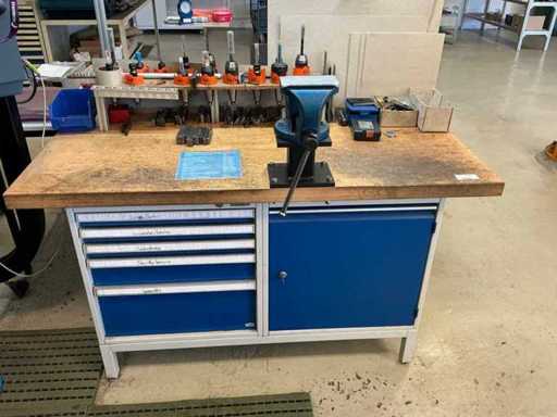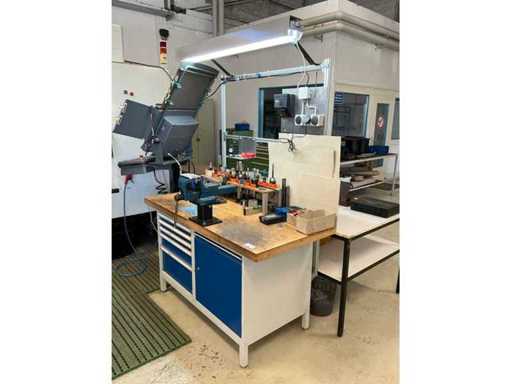 Z oświetleniem, imadłem Holex, 5 szufladami z wiertarką, narzędziami ręcznymi, kołdrem i jednymi drzwiami