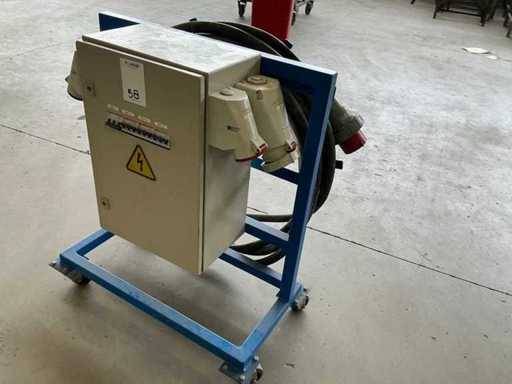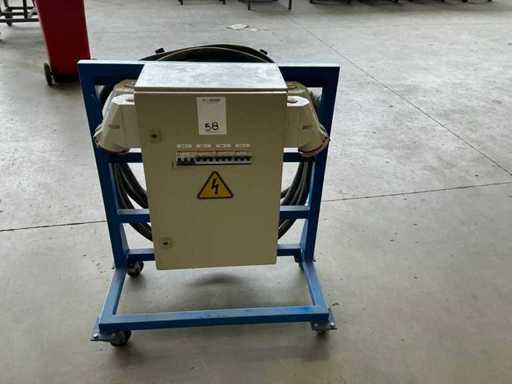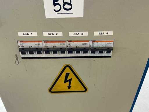 W 400V 63 amperów, wyjście: 2x 63 amperów i 2x 32 amperów, bezpieczniki