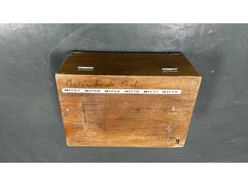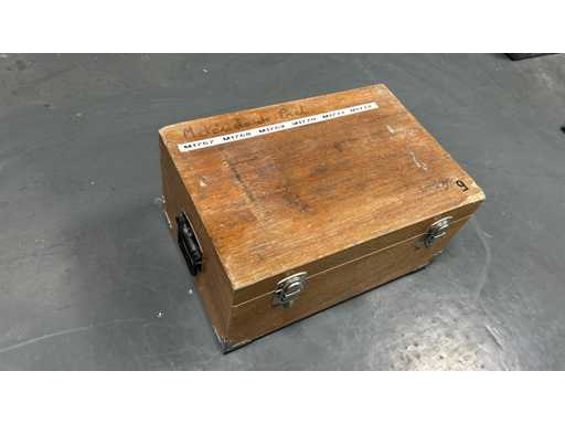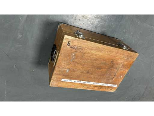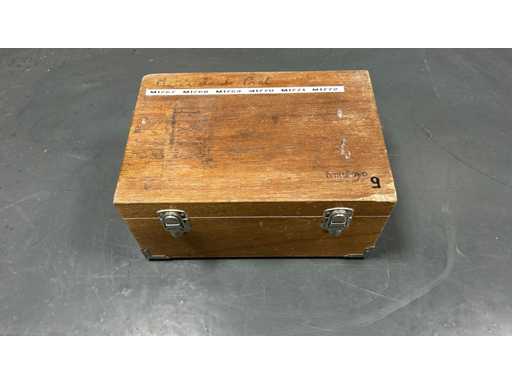 6 mikrometrów z odczytem analogowym (0–25 do 125–150 mm) • Odczyt 0,01 mm • Drewniana skrzynka Mitutoyo.