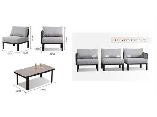 Połączenie ciemnej aluminiowej ramy, szarej wikliny i dopasowanej tapicerki tworzy elegancki, wysokiej jakości wygląd.