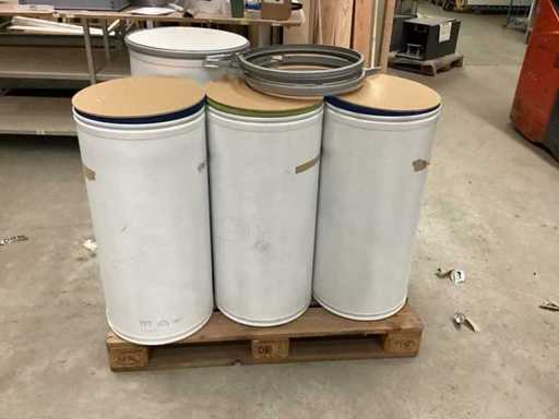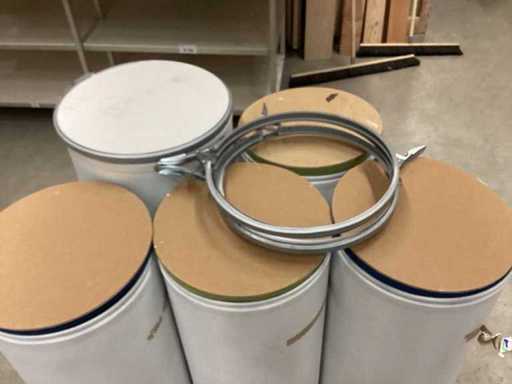 Șase recipiente vrac, din carton alb – capac din lemn ingineresc, inel din metal cu închidere cu capcană Două bucăți de aproximativ 46 cm în diametru și 48 cm înălțime Patru piese cu un diametru de 40 cm și o înălțime de 80 cm Palet în schimb