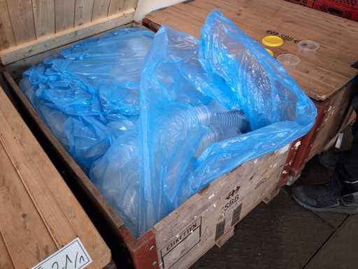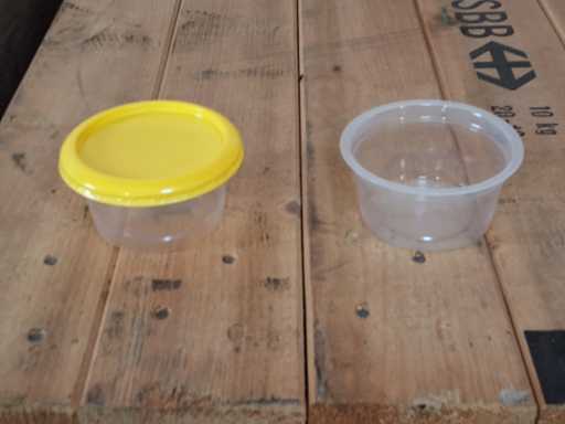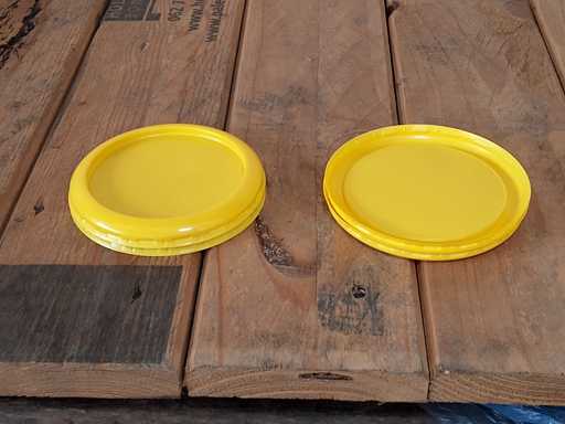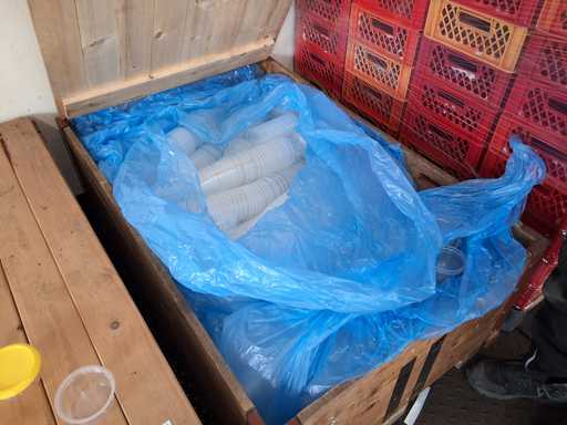 3 pallets cup + lid Greiner, sealed cup in 2 SSB Euroboxes, lid in 1 x SSB Eurobox, mBecher approx. 5900 pieces Ø 95 / height 48 mm transparent PP, lid yellow approx. 3000 pieces