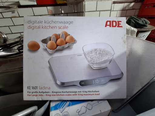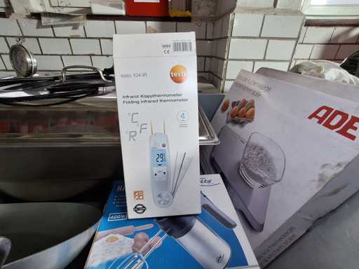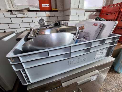 Lots of kitchen utensils / work equipment, in Auer Box, 1 x hand mixer Elta 400 W, 1 x infrared folding thermometer Testo 104-Ir, 1 x frying pan, 1 x kitchen scale ADE KE1601 Ladina, 1 x Chafing Dish Horeca electric, 1 x refrigerator thermometer