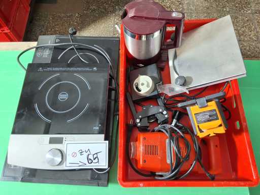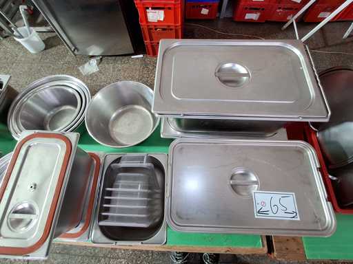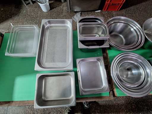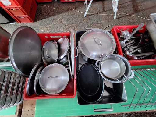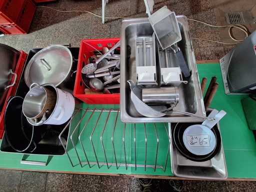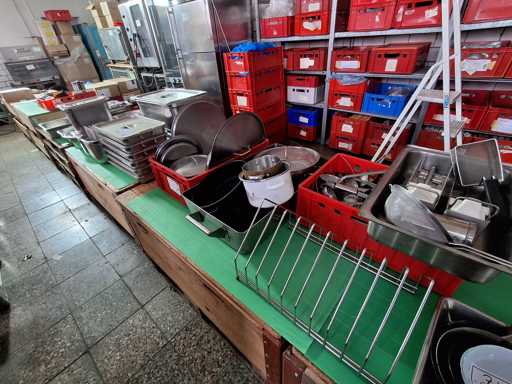 Large batch of kitchen utensils, GN containers + strainers in various sizes, induction plates, bowls, pots, pans, knife sharpeners, kettles, sieves, blenders, ladles, etc.
