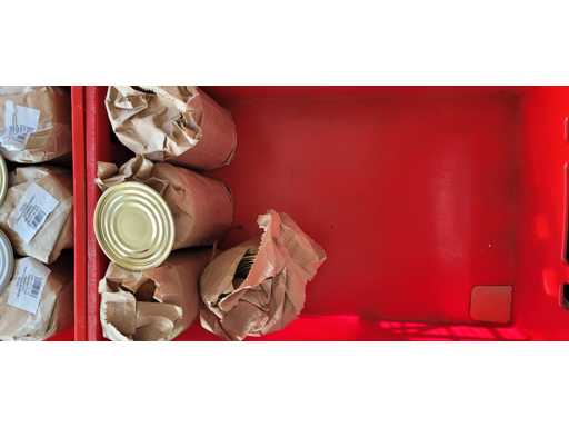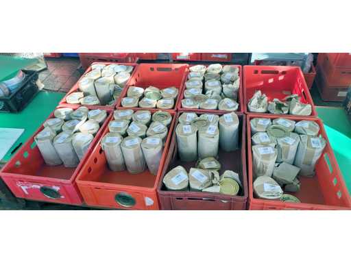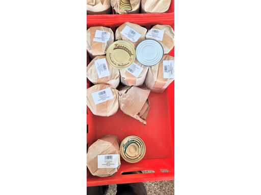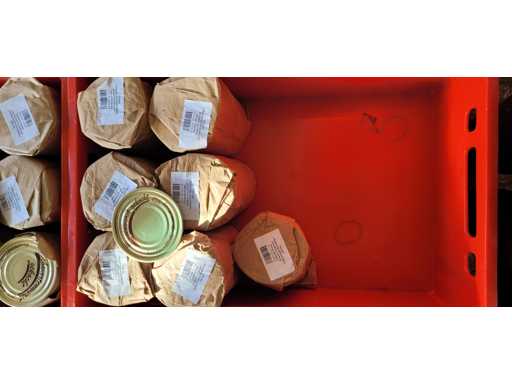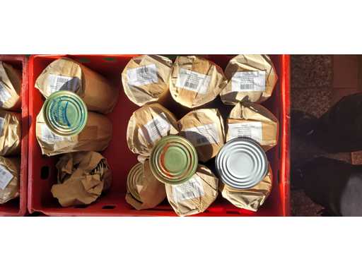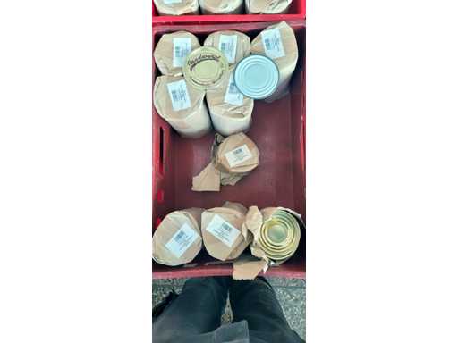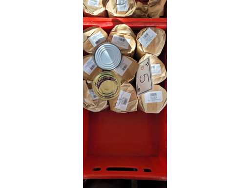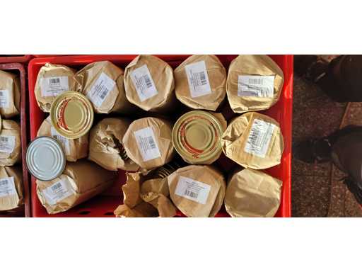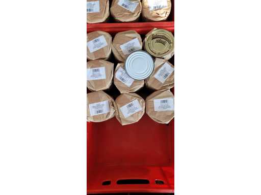 Lots of can closure lids / folded lids Ø 99 mm, approx. 6900 pieces of various inscriptions such as Bregenwurst, liver sausage, hunting sausage, red sausage, pork knuckle meat, squirrel sausage, braised sausage, aspic, pork rind sausage and neutral