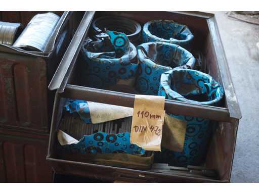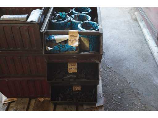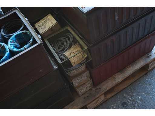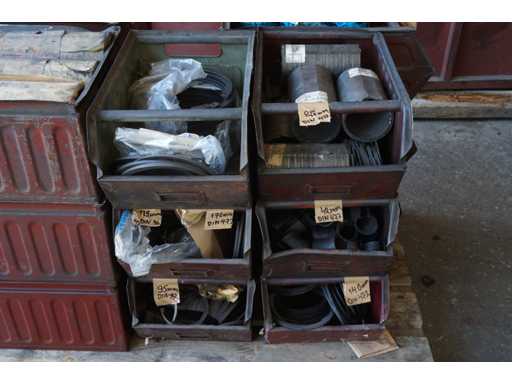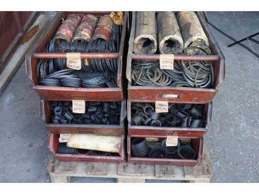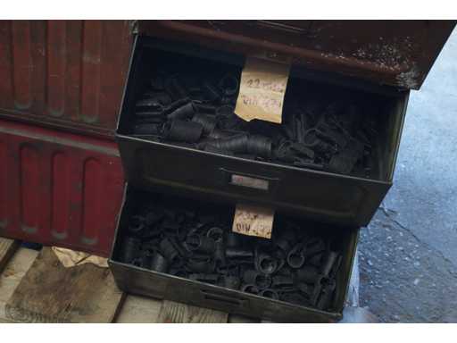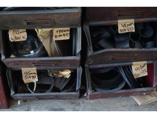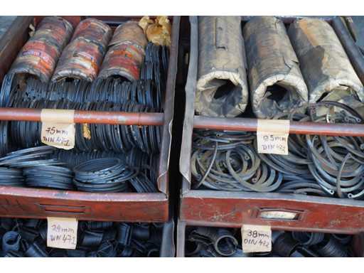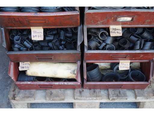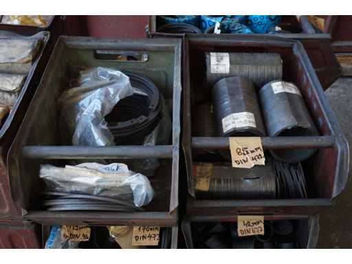 Lot de inele de fixare pentru arbori (DIN 471) și pentru alezaje (DIN 472). Negru. Greutatea totală (palet inclus) este de 382 kg.