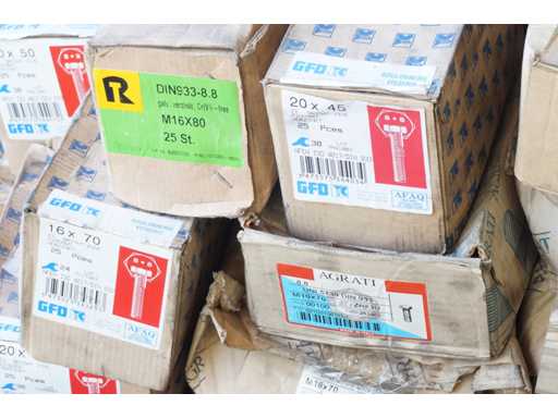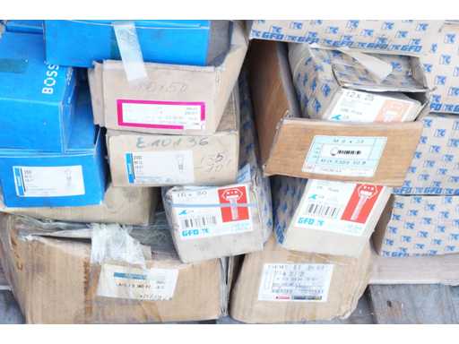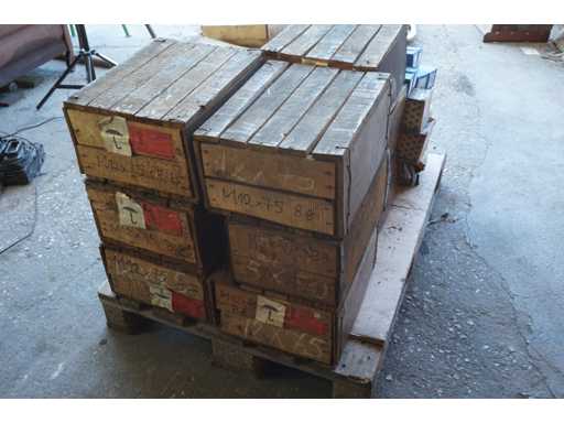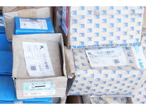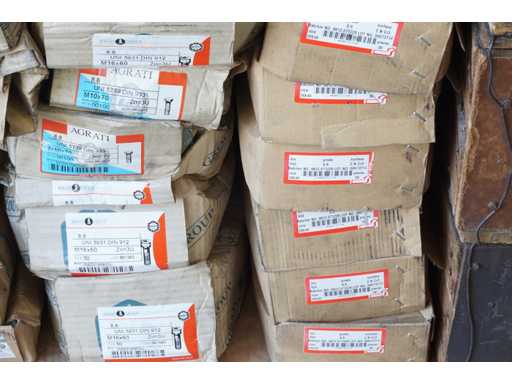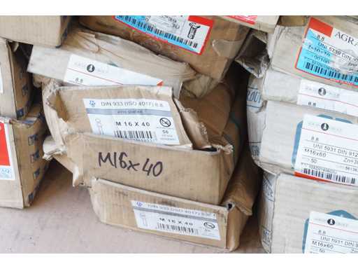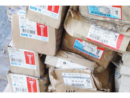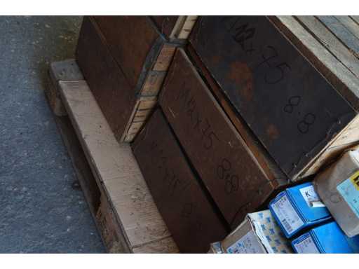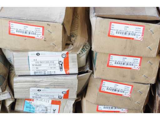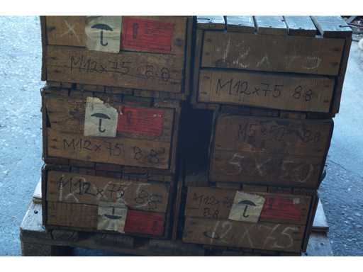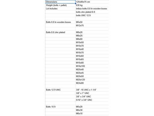 O mulțime de șuruburi. Șuruburi Imbus M12x75 și M5x50 cu rezistență 8,8 în 9 cutii din lemn. Șuruburi (DIN 912 și DIN 933) zincate metrice cu rezistență 8,8 - dimensiuni de la M8 la M24. Șuruburi UNC cu rezistență 12.9. Greutatea totală (palet + șuruburi) este de 630 kg
