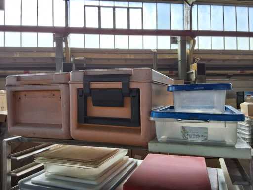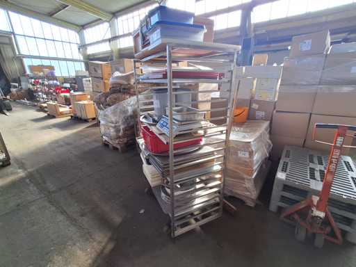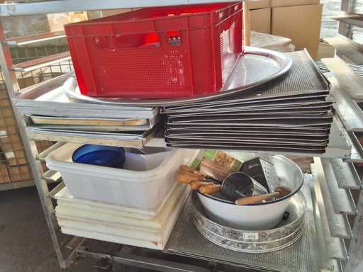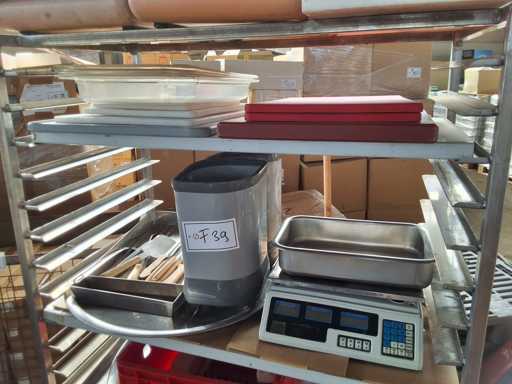 Trolleys with kitchen accessories, stainless steel trolleys with contents Kitchen accessories, including 1 scale + baking trays + warming containers + bowls + trays + glasswasher + cutting boards and other accessories