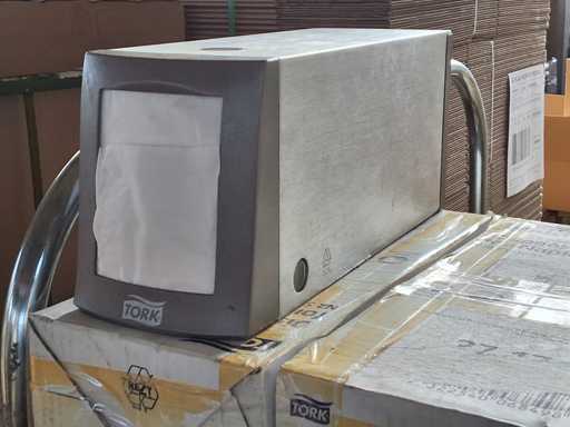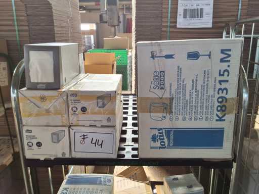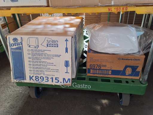 Trolley with TORK + LOTUS towel and napkin dispenser, trolley with hygiene product contents, 5 x Tork N2 System napkin dispensers, 3 x Lotus Series 3000 towel dispensers, 1 x Tork cardboard napkins
