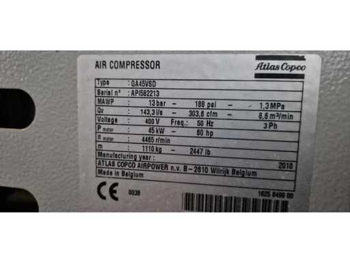 2010 ATLAS COPCO GA 45 VSD Screw Compressor Speed Controlled