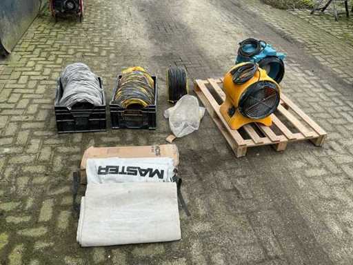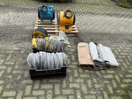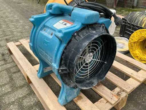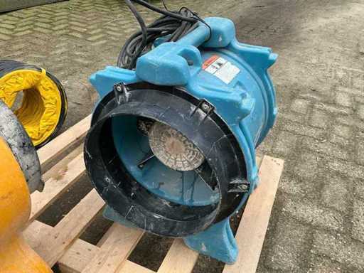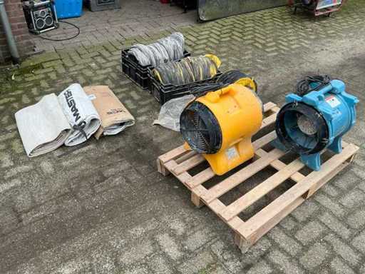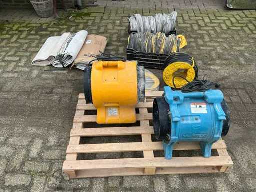 Echipat cu: 2 piese. 1 de la MCS. 1 de la Vortex (Dri-Eaz F174 (230V BLU)) este un ventilator/ventilator portabil care funcționează pe 230 V, 50 Hz și aproximativ 2,2 A. Cu 2 furtuni de 10 metri pentru utilizare interioară. 1x furtun de 10 metri, nou și niciodată folosit. și 3 filtre. MCS BL 6800 este un ventilator axial portabil cu o capacitate de aer de aproximativ 3900 m³/h, o putere de 750 W, funcționând pe 240 V și 50 Hz, 3900 m3/h-m3/4
