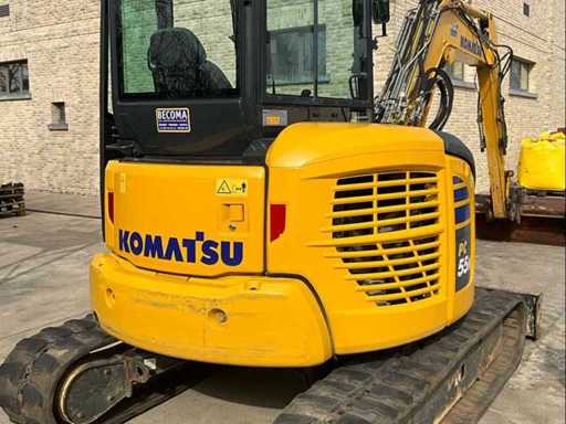 Well-maintained and fully working Komatsu PC55MR-5EO mini excavator with closed cab. Compact but powerful excavator with excellent stability, hydraulic performance and very good visibility from the cab. The machine is equipped with a dozer blade, hydraulic lines for attachments and wide bucket. Thanks to its compact swing radius (MR series), this excavator is ideal for work in small or limited workshops. The cab is spacious and comfortable with a modern LCD display and joystick controls - Excavation performance: maximum digging depth ± 3.7 – 4.1 m, maximum reach ± 6.0 m, bucket capacity ± 0.06 – 0.18 m³ – closed cab, joystick control, digital Komatsu display, working modes (ATT / P etc.), 6 hydraulic lines for attachments, dozer blade, wide bucket