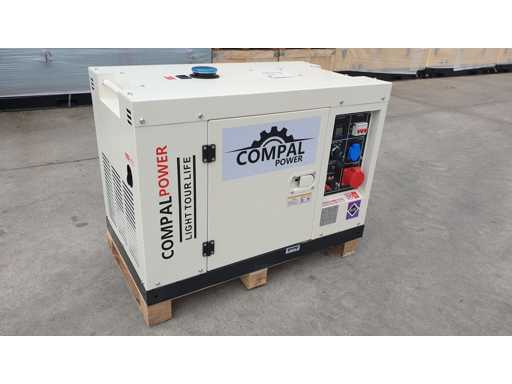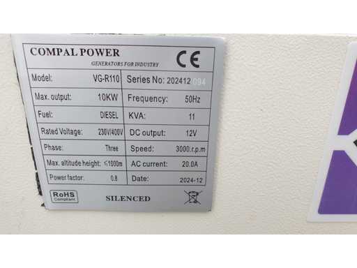 COMPAL POWER VG-R110 generator electric, super silențios, aprindere electrică, motor diesel cu sistem de reducere a consumului, protecție stabilizată împotriva curentului, control electronic al tensiunii Ieșiri 220/380 Volți, putere 10 kW-11 kVA