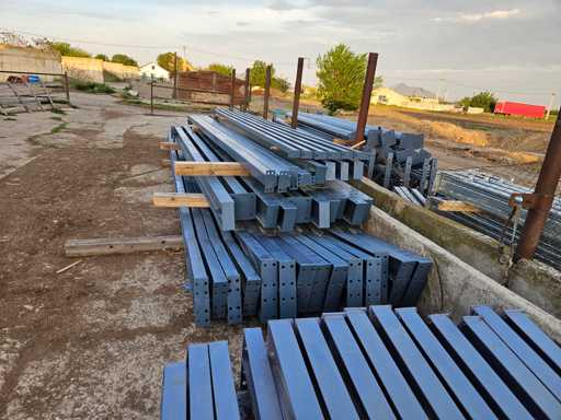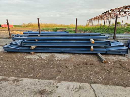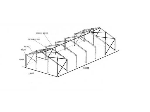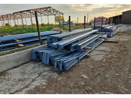 Additional information Roof slope: 20 degrees; Painted RAI 5023; The structure consists of: 2 beams (trusses) on the ends which are from the IPE 160 profile; 5 intermediate beams (trusses) from the IPE 220 profile, 4 end posts from the IPE 160 profile, 10 intermediate posts from the IPE 220 profile;, 4 door posts from the square tube 100x100x4; 6 pressure struts from 76X4 pipe: wind strip for beams and posts made of galvanized steel with 16mm tensioner; the entire structure is on bolts (removable); Condition: unused; The entire structure includes Certificate of Conformity for materials, construction sketch, foundation plan. free loading.