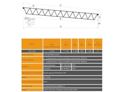 Oțel zincat; profil superior 80x40x3, profil inferior 100x40x3, contravântile transversale 40x40x2, clasa de construcție EXC2, standard EN-1090-2, protecție a suprafeței zinc la cald PN-EN ISO 1461