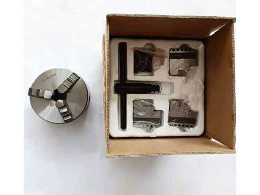 3 UNITĂȚI/SETURI DE ATT0027 AMBALATE ÎMPREUNĂ. UN SINGUR ATT0027 CORESPUNDE PUI: Mandrină pentru strung autocentrat 3 + 3 fălci 100mm, 3500 r/min, corp din fontă rectificată, închidere cu inel elicoidal, prindere manuală concentrică, fălci călite