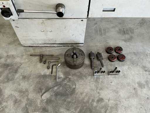 Echipat cu: strung convențional MONDIAL CELTIC 14, distanță între centre 1000mm, viteze mecanice, tăiere filetată fază posibilă 230V, motor cu 2 trepte, 16 viteze reglabile ale axului de la 24 la 1000 rpm, sursă de alimentare acționată în ambele direcții, tot transversală, protecție de siguranță pentru mandrină, protecție împotriva stropirii, suport de scule cu schimbare rapidă cu 2 suporturi, ax spate MT3, înălțime centrală: 180 mm, alezaj ax: 35 mm, dimensiuni (aprox.) lungime: aprox. 2.100 – 2.200 mm, Lățime: aprox. 900 mm, înălțime: aprox. 1.200 mm, greutate: aprox. 1.000 – 1.200 kg, incluzând centrele, suporturile pentru scule și 4 fălci.