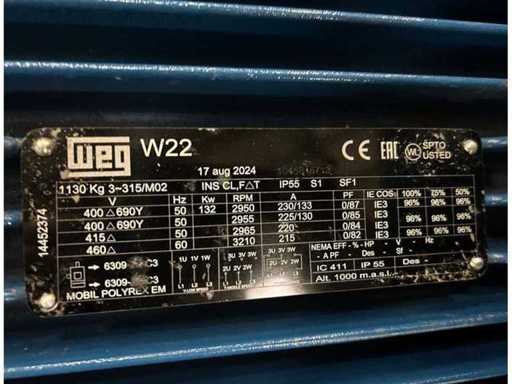 Motor electric WEG, 132 kW, 2950 rpm, 400-690 Volți, IE3, greutate aprox. 1130 kg, neutilizat