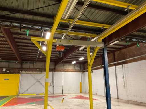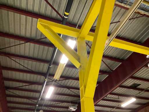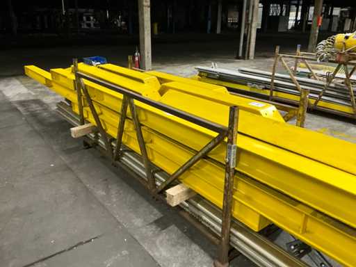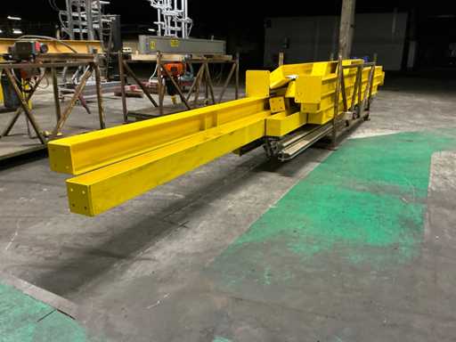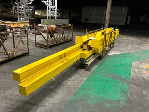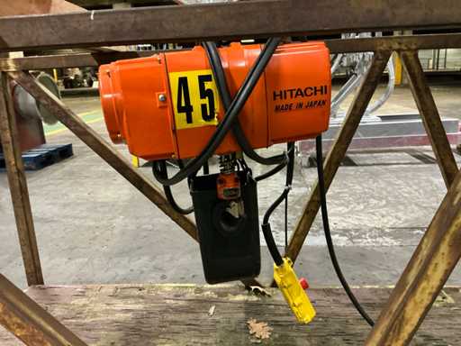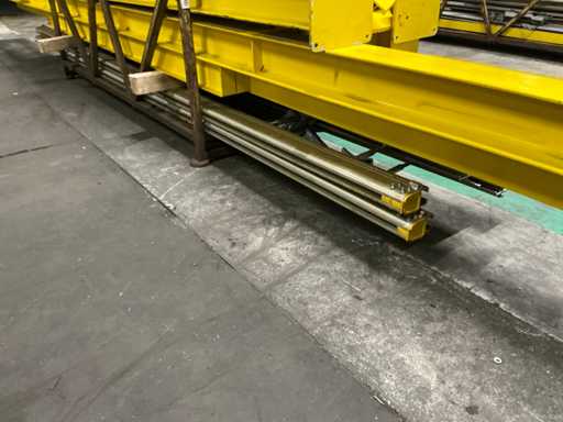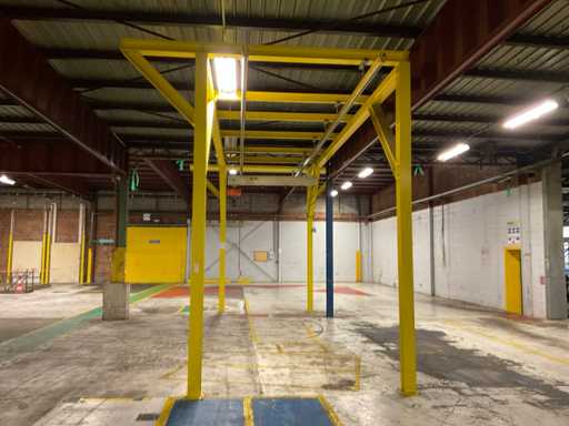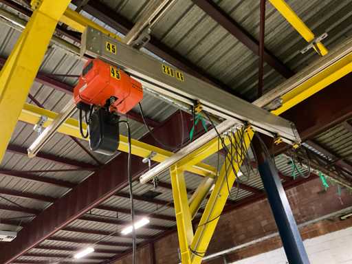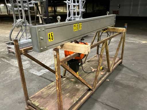 cu sistem de șine suspendate, echipat cu un lift electric cu lanț Hitachi de 250 kg, o deschidere de aproximativ 2,5 m cu o capacitate de încărcare de 250 kg, cu 2 pasarele de aproximativ 10 m, inclusiv un portal din oțel cu înălțimea de aproximativ 4,5 m