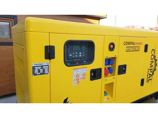 Remorcă completă cu generator, remorcă cu 4 anvelope pentru transportul generatoarelor, masă totală 1030 kg, suspensie cu arcuri lamelare, 4 anvelope 165/70/13, cârlig de cuplare rapidă, niciodată folosită și neînmatriculată pentru circulație, COMPAL POWER VG-R30 generator electric, super silențios, aprindere electronică automată, motor Ricardo cu 4 cilindri răcit cu apă, motor cu sistem de reducere a consumului de combustibil. Ieșiri: 220/380 Volți, putere 30 kW-41, 3kVA