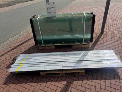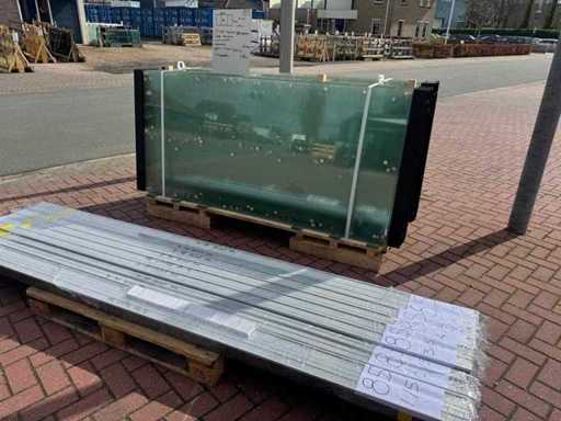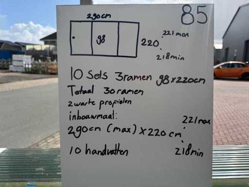 10 seturi de 3 ferestre glisante – 98 cm x 220 cm, sticlă transparentă • Dimensiuni pe fereastră: lățime 98 cm, înălțime (dimensiunea zilei) 220 cm • Lățime maximă a setului complet: 290 cm • Total: 30 de ferestre (10 seturi de câte 3 piese) • Material și culoare: cadru negru din aluminiu, sticlă transparentă • Include: 10 șine superioare și 10 inferioare cu 3 șine • 10 mânere • Condiție: Lot – poate conține dungi sau pete ușoare • Ambalare: pe palet cu sticlă • Notă: fotografia cu copertina este în scop ilustrativ • Un stivuitor este disponibil pentru colectare