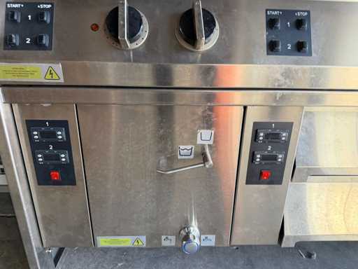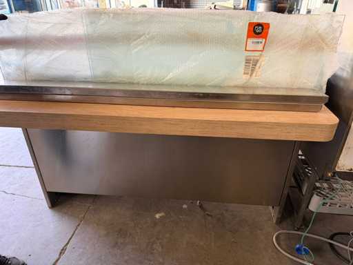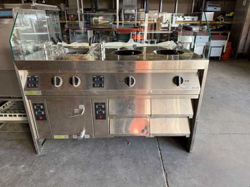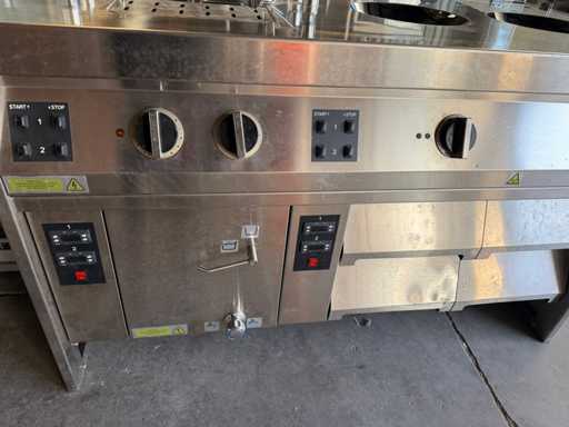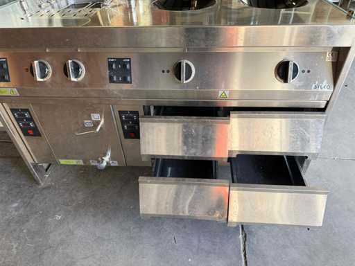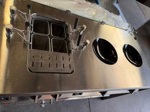Echipată cu friteuză cu apă; 2 vârfuri Shott Ceran pentru wok cu inducție; Sertare; cu dimensiuni de aproximativ 156x120x120cm; conexiune 380V; Înălțime de lucru 95cm. Material - Oțel inoxidabil